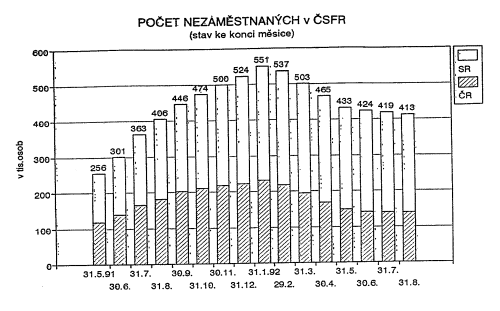 Počet volných pracovních míst se stále zvyšuje, což rozšiřuje možnosti nalézt zaměstnání. Koncem srpna 1992 klesla míra nezaměstnanosti v ČSFR na 5.3 %, v ČR na 2.7 %, v SR zůstala i nadále vysoká a činila 10,9 %.