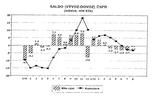 Obchodní bilance ČSFR je za 8 měsíců r. 1992 mírně deficitní v rozsahu 3.0 mld Kčs. Vývoz v tomto období činil 202.2 mld. Kčs, dovoz 205.2 mld Kčs. Proti stejnému období minulého roku klesl vývoz o 0.9 %, objem dovozu je přibližně na loňské úrovni. Původně přebytková obchodní bilance se od dubna začala snižovat (dovoz vyšší než vývoz) a od července přešla do pasiva. Z hlediska zbožové struktury roste podíl spotřebního zboží na dovozu a na druhé straně roste vývoz surovin a produktů pro mezispotřebu. Vzhledem k růstu reálných příjmů obyvatelstva a předvánočnímu období zvýšených nákupů lze očekávat do konce roku spíše prohloubení deficitu obchodní bilance.