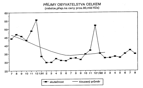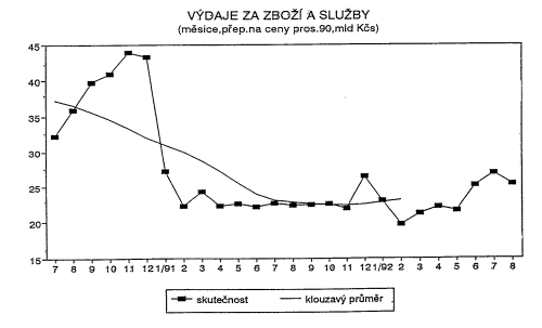 Výdaje obyvatelstva (rozdíl mezi disponibilními příjmy a přírůstkem úspor) za leden - srpen 1992 nominálně vzrostly proti stejnému období m. r. o 12.9 %, reálně (při růstu spotřebitelských cen o 10.7 %) byly vyšší o 2.0 %. Z toho výdaje za zboží a služby reálně zůstaly na úrovni osmi měsíců předchozího roku. Postupně se v poptávce po zboží a službách již začíná projevovat oživení (samotný srpen letošního roku je reálně o 13 % vyšší než stejný měsíc m. r.).