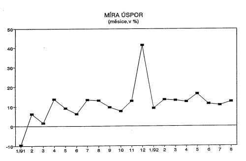 Míra úspor (podíl přírůstku úspor v nejširším pojetí na disponibilních příjmech) za 8 měsíců t. r. činila 12,5 % (za stejné období roku 1991 jenom 7.1 %). Prosincový extrém v grafu je způsoben připsanými úroky z vkladů. V dosavadním průběhu letošního roku je naznačena tendence k mírnému růstu.