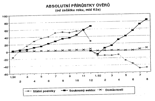 Celkový objem domácích úvěrů vzrostl za 8 měsíců proti počátku roku o 9.9 % ze 770.4 mld Kčs na 847.3 mld Kčs. Úvěry podnikům a domácnostem se zvýšily za 8 měsíců o 78 mld Kčs na 778 mld Kčs, tj. o 11.1 %. Dynamicky se vyvíjely úvěry soukromému sektoru, které v tomto období vzrostly o 84 mld Kčs a proti stavu koncem m. r. se více než zdvojnásobily. V současné době činí již úvěry soukromému podnikání 20 % z celkových stavů úvěrů podnikům a domácnostem. Úvěry státním podnikům se za toto období snížily o 47.9 mld Kčs, tj. o 10 %. Projevuje se zde stagnace investičních úvěrů u státních podniků a převod úvěrů privatizovaných podniků na soukromý sektor. Úvěry domácnostem vzrostly o 6.5 mld Kčs, tj. o 11.7 %.