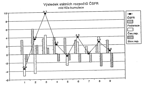 Z přehledu je zřejmé, že zhoršení se soustředilo prakticky do rozpočtu federace, jehož výsledky jsou proti minulému roku horší o 14,5 mld Kčs (v roce 1991 se však celoročně uvažovalo s přebytkem federálního rozpočtu ve výši 6,2 mld Kčs).