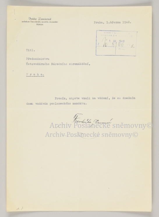 ![]() | Františka Zeminová (1882-1962) Členka České strany sociální. Poslankyně RNS od 14. 11. 1918 do 15. 4. 1920. Nejdéle působící poslankyně v Československu v letech 1918-1938 a 1945-1948. Životopis Záznam z procesu s F. Zeminovou v r. 1950 (součást procesu s M. Horákovou, NFA). |