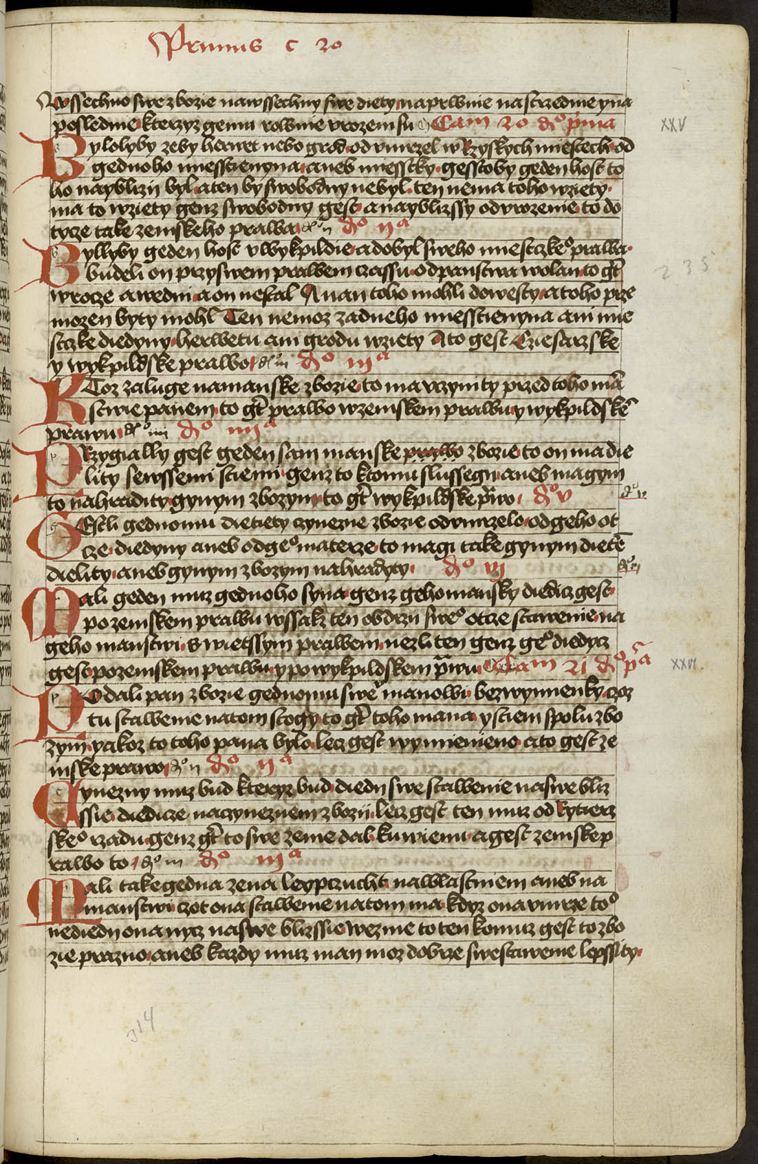 300r - 403v [Rukou 17. století] Liber distinctionum. [Text] Tyto knihy sú knihy vikpildové práva sasíckého řádu, jakož Meydburk požívá a hallišené, jenž své svolení práva tu berú, a ty z Lipska v Halli a k tomu mnoho měst v tom markrabství v Míšni, jenž své svolení v Halli a v Lipsku berú ... Prologus. Svatý Řehoř i jiní světí doktorové v božských knihách a v právech píší nám o té svaté svatosti svatého manželstva, že žádné urozenie není lepší ku vysokému kněžstvu, v němž se sám buoh dal jest ... [f. 300v] Capitolum primum. Buoh ostavil dva meče ku obraně na zemi svatého křesťanstva, jakož nám písmo píše, papežovi duchovní a císařovi světský. I jest císař dlužen na určené časy, když papež chce vsésti na svój bílý kuoň ... x ... Capitolum 27 distinccio prima. ... ani služby ani žádného koli práva, než to povolí topl, to jest zemského lidu obec. Tuto se počínají knihy sedmé o věrné ruce.