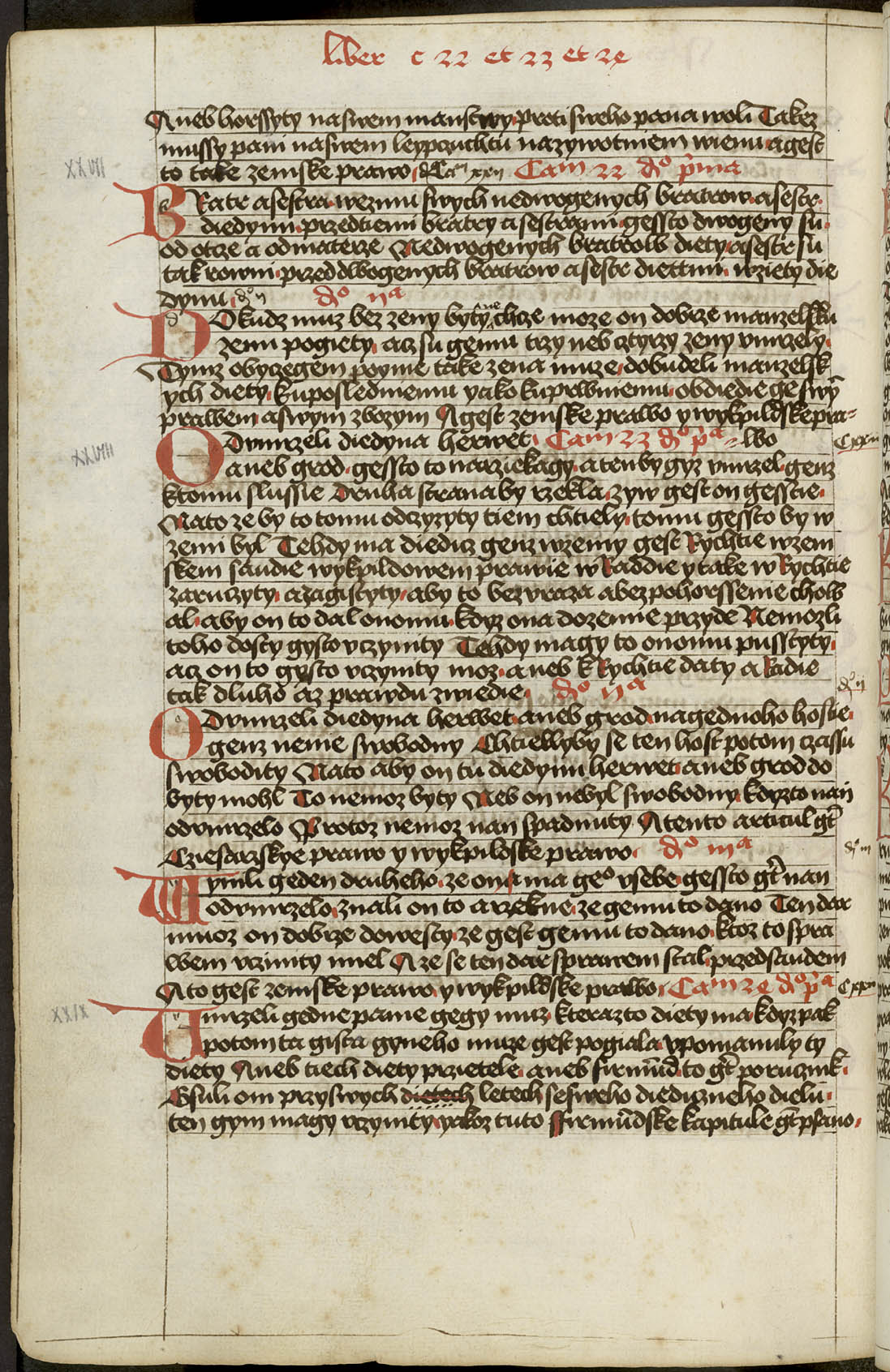300r - 403v [Rukou 17. století] Liber distinctionum. [Text] Tyto knihy sú knihy vikpildové práva sasíckého řádu, jakož Meydburk požívá a hallišené, jenž své svolení práva tu berú, a ty z Lipska v Halli a k tomu mnoho měst v tom markrabství v Míšni, jenž své svolení v Halli a v Lipsku berú ... Prologus. Svatý Řehoř i jiní světí doktorové v božských knihách a v právech píší nám o té svaté svatosti svatého manželstva, že žádné urozenie není lepší ku vysokému kněžstvu, v němž se sám buoh dal jest ... [f. 300v] Capitolum primum. Buoh ostavil dva meče ku obraně na zemi svatého křesťanstva, jakož nám písmo píše, papežovi duchovní a císařovi světský. I jest císař dlužen na určené časy, když papež chce vsésti na svój bílý kuoň ... x ... Capitolum 27 distinccio prima. ... ani služby ani žádného koli práva, než to povolí topl, to jest zemského lidu obec. Tuto se počínají knihy sedmé o věrné ruce.