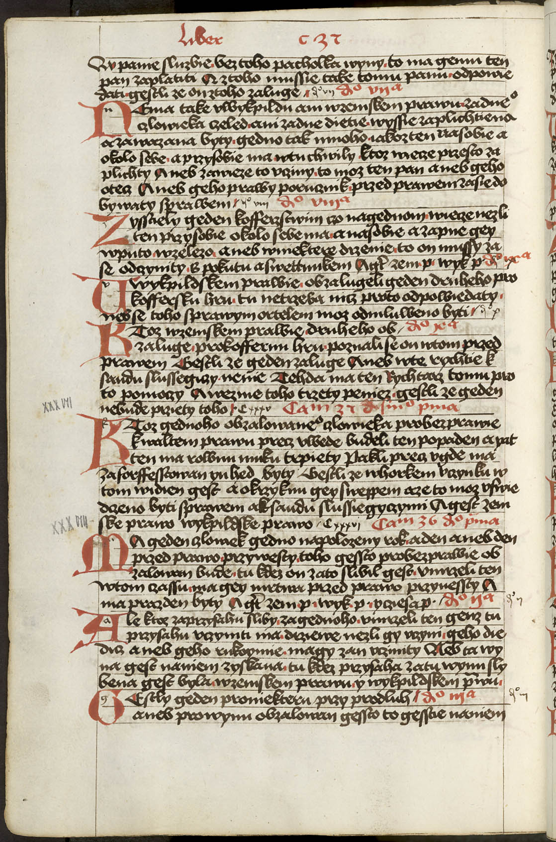 353r - 387v Incipit quartus liber ... x ... Tyto čtvrté knihy dokonané zpravují o všelikém bezpráví a která poprava na které bezpráví sluší, jakož napřed psáno stojí, a o ranách krvavých, o bytu, o násilí, o vraždách, o popravách a sedání, a má kapitol XLIIII s svými distikcimi.