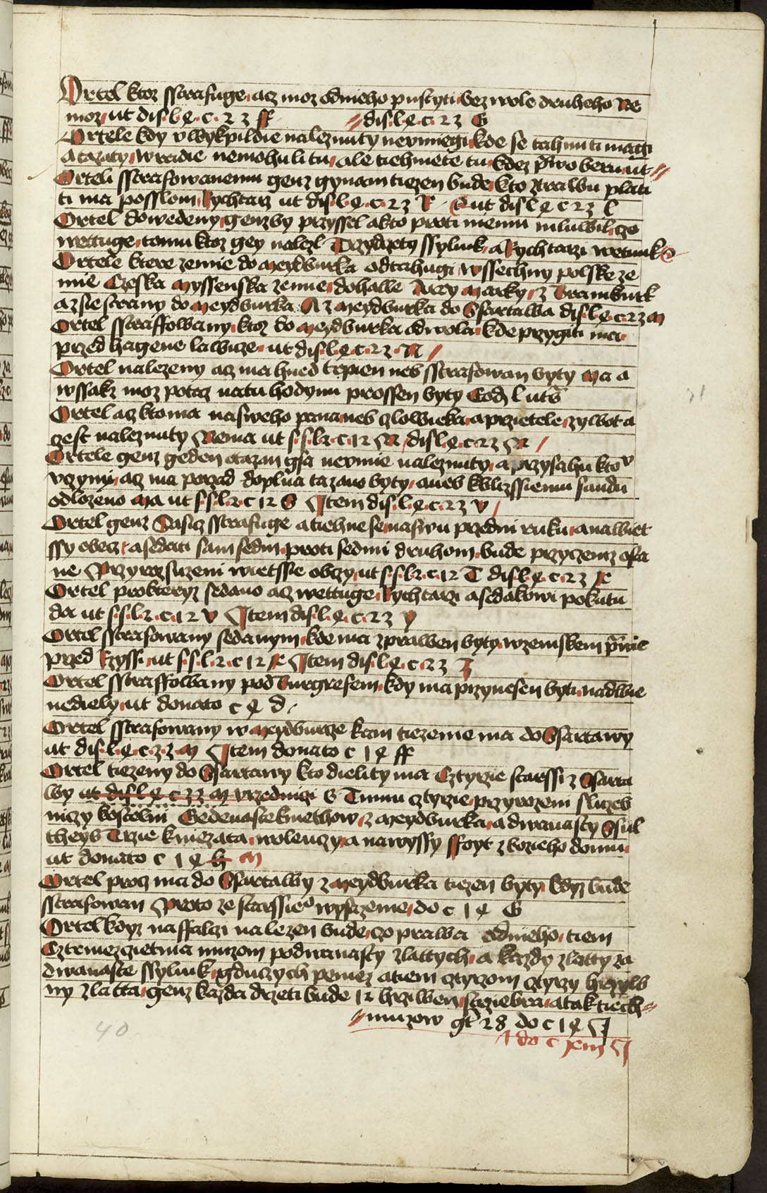 Ir - 95v Abatyše k vojštytu volena ať má manství přijieti, dovod toho v zrcadle sasíckém jinak Speculo Saxonico libro tercio capitulo 19 a v jiných knihách distinccionum libro VIo capitulo II praví, že má přijieti. ... x ... Zrušenie smlúvy před právem učiněné, čím má odloženo býti. Pro ránu ruku, pro vraždu hrdlem ut do. c. z. l. de S. Zrušenie zprávy hledaj napřed de Z. Et sic est finis huius operis per me Jacobum Kožený de Krbova anno domini M CCCC LXIX currente, feria sexta post festum beate Lucie virginis [1469]. Hoc opus presens laboriose utilitate pro communi consumavi.