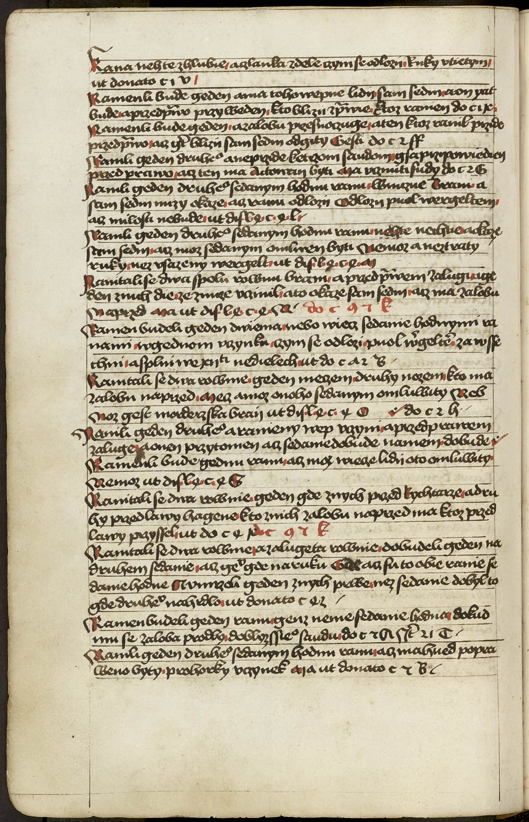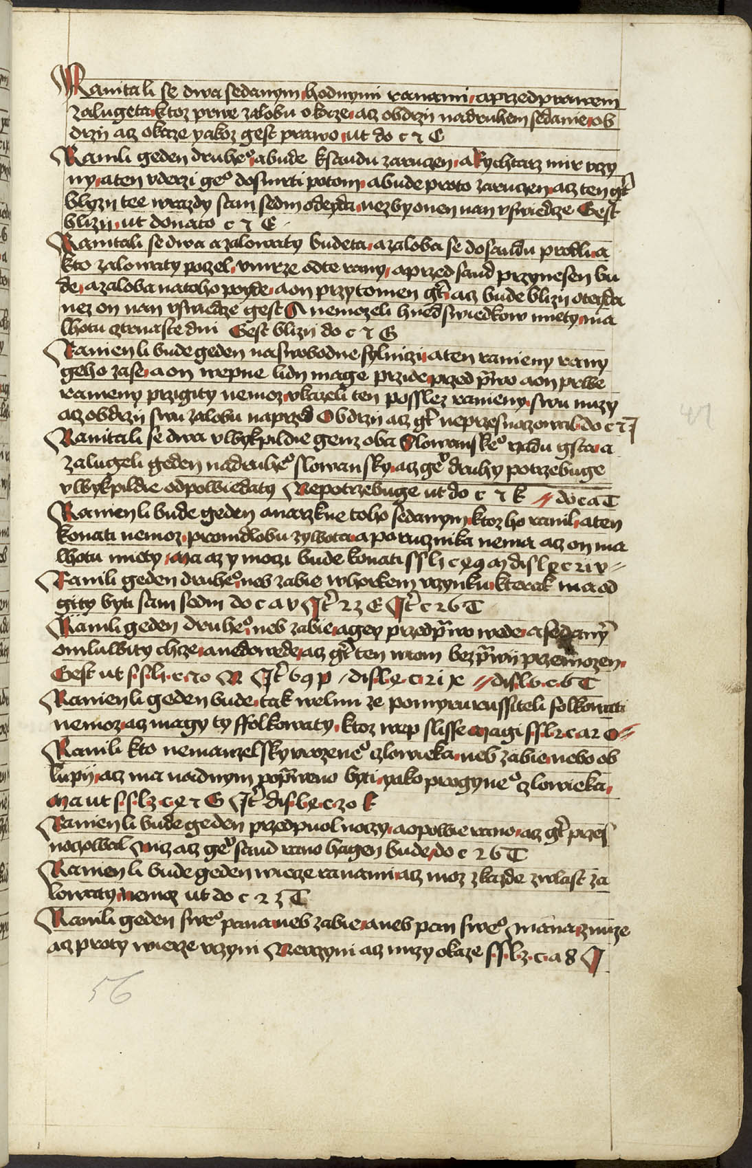 Ir - 95v Abatyše k vojštytu volena ať má manství přijieti, dovod toho v zrcadle sasíckém jinak Speculo Saxonico libro tercio capitulo 19 a v jiných knihách distinccionum libro VIo capitulo II praví, že má přijieti. ... x ... Zrušenie smlúvy před právem učiněné, čím má odloženo býti. Pro ránu ruku, pro vraždu hrdlem ut do. c. z. l. de S. Zrušenie zprávy hledaj napřed de Z. Et sic est finis huius operis per me Jacobum Kožený de Krbova anno domini M CCCC LXIX currente, feria sexta post festum beate Lucie virginis [1469]. Hoc opus presens laboriose utilitate pro communi consumavi.