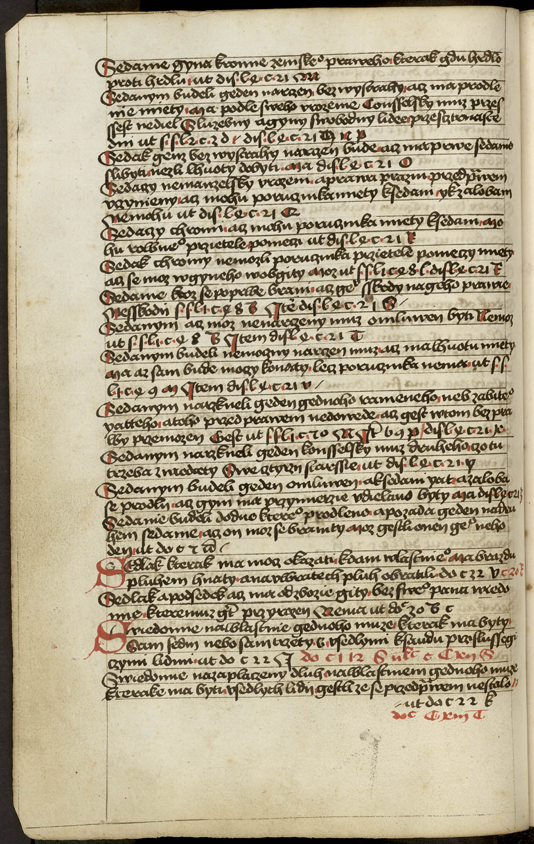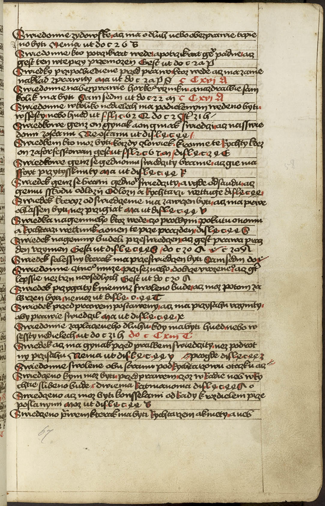 Ir - 95v Abatyše k vojštytu volena ať má manství přijieti, dovod toho v zrcadle sasíckém jinak Speculo Saxonico libro tercio capitulo 19 a v jiných knihách distinccionum libro VIo capitulo II praví, že má přijieti. ... x ... Zrušenie smlúvy před právem učiněné, čím má odloženo býti. Pro ránu ruku, pro vraždu hrdlem ut do. c. z. l. de S. Zrušenie zprávy hledaj napřed de Z. Et sic est finis huius operis per me Jacobum Kožený de Krbova anno domini M CCCC LXIX currente, feria sexta post festum beate Lucie virginis [1469]. Hoc opus presens laboriose utilitate pro communi consumavi.